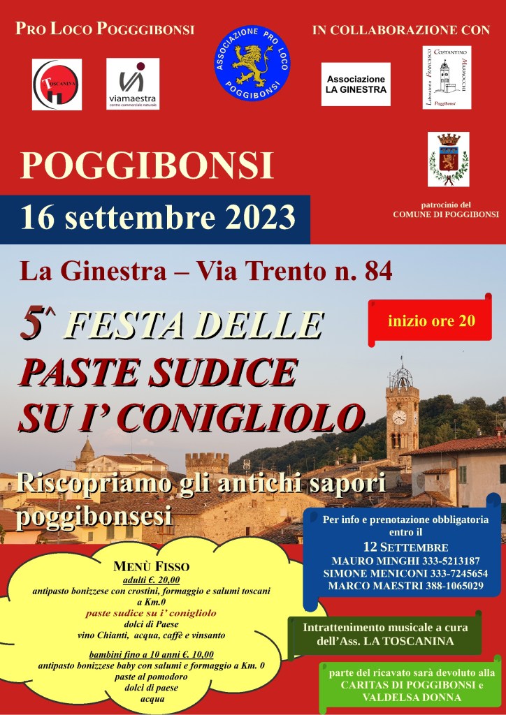Il 16 settembre torna la 5^ Festa delle Paste Sudice su i’ Conigliolo, tipico piatto poggibonsese Pubblicato da prolocopoggibonsi il 14 agosto 20239 settembre 2023 Condividi: Condividi su X (Si apre in una nuova finestra) X Condividi su Facebook (Si apre in una nuova finestra) Facebook Mi piace Caricamento... Correlati