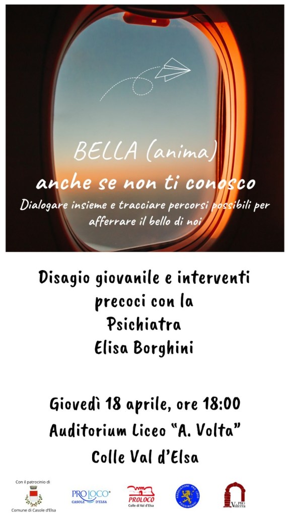Il disagio giovanile… ne parla la D.ssa ELENA BORGHINI (psichiatra) Pubblicato da prolocopoggibonsi il 17 aprile 2024 Giovedì 18 aprile 2024 alle ore 18 presso l’Auditorium del Liceo Volta a Colle val d’Elsa Condividi: Condividi su X (Si apre in una nuova finestra) X Condividi su Facebook (Si apre in una nuova finestra) Facebook Mi piace Caricamento... Correlati