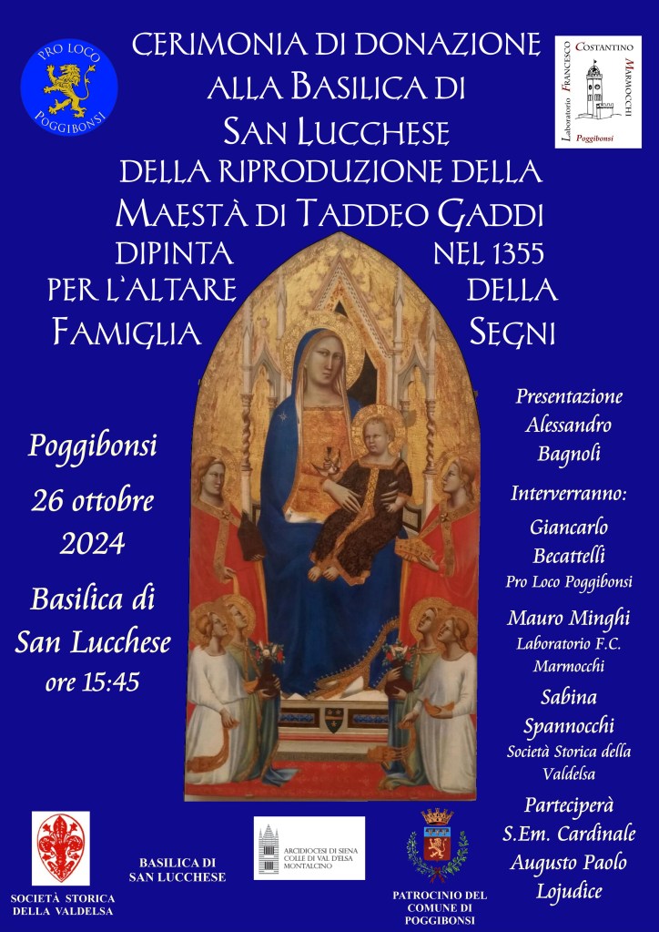 Sabato 26 ottobre la Pro Loco di Poggibonsi e il Laboratorio Francesco Costantino Marmocchi doneranno alla Basilica di San Lucchese la riproduzione della Maestà di Taddeo Gaddi, dipinta nel 1355 dall’allievo di Giotto, per l’altare della famiglia Segni. L’evento è realizzato in collaborazione don La Società Storica della Valdelsa, L’Arcidiocesi di Siena e la Basilica di San Lucchese.